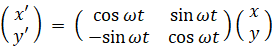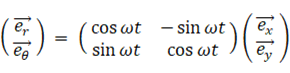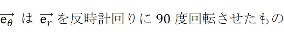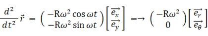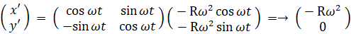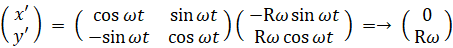 これらの3つの式を 座標原点にいて物質の等速円運動の角速度と同じ角速度で自転している観察者が観察するとどのようになるか 表したのが次の3つの式です。