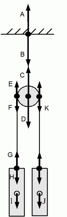 滑車が天井から紐でつり下げられています。 この滑車にロープをかけ、 両端に同じ質量の重りをつないで吊り合わせます。 このとき、 2つの重りに働く重力( I と J ) はどのようにして天井に伝わっているのか見てみましょう。 ただし、 滑車やロープや紐の質量は