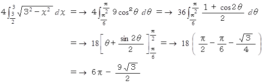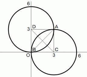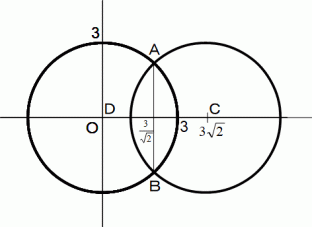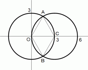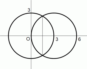 直径 3cm の円が2つある。 2つの円の中心の距離は 3cm である。 重なる部分の面積はいくらか?