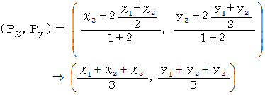 とすると、 三角形の重心の座標値は次の式で表されるのことを証明しましょう。