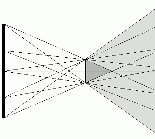 点光源が1つの平面に集合し全体として円となった円光源を作ります。 円光源を陰を作る円柱の底面よりも大きくします。 横から見た図を示します。