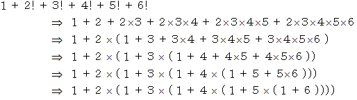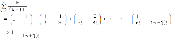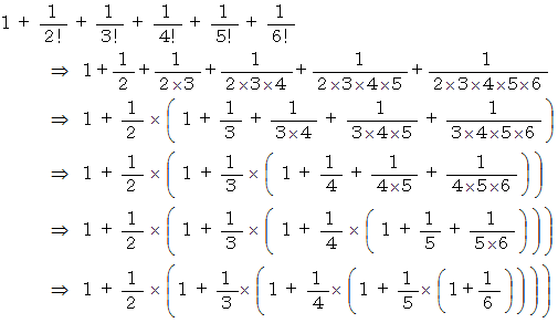 で、 無限大項までの和は ネイピア数 であることが解ります。漸化式がなくとも、 この数列の 項 と それまでの和 を求める十進BASIC のプログラムを作ることができます。 最初にこの数列の6項までの和を変形していってフルクタル的な式を導きましたが、 それを利用するのです。