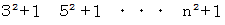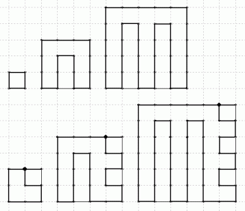 奇数マスのときは、 一辺の長さが2マスずつ大きくなるにつれ、 最短ルートの道のりは、 一辺の長さが 1 マスの正方形の場合から、 次のように増えていきます。 それは、 正方形に含まれる交点の数と同じです。