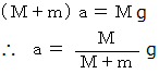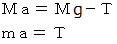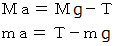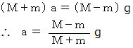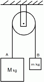図のように滑車に2つの重りが吊り下げられています。 滑車には歯止めがかけられており、 静止しています。 歯止めを解除すると、 重りA は地に向って、 重りB は天に向かって、 等しい加速度で等加速運動を開始します。 このときの紐の張力を T として、 2つの重りについて運動方程式を立てることによって、 加速度の大きさを M と m を使って表しなさい。 ただし、 空気抗力はないものとします。