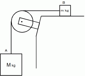 図のように滑車を介して2つの重りが紐で繋げられています。 滑車には歯止めがかけられており、 静止しています。 歯止めを解除すると、 重りA は下に向って、 重りB は左に向かって、 等しい加速度で等加速運動を開始します。 このときの紐の張力を T として、 2つの重りについて運動方程式を立てることによって、 加速度の大きさを M と m を使って表しなさい。 ただし、 摩擦力や空気抗力はないものとします。