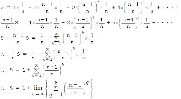 この問題を解いて判ったことは、「1回の試行で念願成就する確率が P でずっと一定のとき、念願成就するためには平均 1/P 回 試行することが必要である。」ということです。