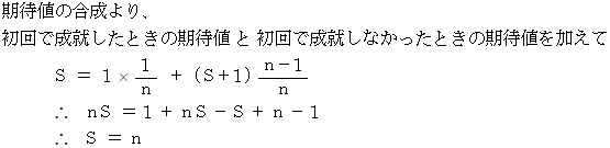 1回の試行で念願成就する確率が 1/n でずっと一定であるので、念願成就するためには 平均 n 回 試行することが必要である。