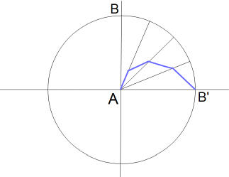 静止摩擦力は発生しますが運動摩擦力が全く生じない円盤が反時計回りに等速自転しています。円盤の中心にあなた (A) が乗っていて円盤の縁にあなたの友達 (B) が乗っています。あなたやお友達は円盤と同じ角速度で自転しています。あなたは友達に向けてボールを転がしますが、円盤が自転しているためにボールはあなたから見て友達よりも右側に大きくそれていきます。下の図の青色は、あなたの座標系におけるボールの軌跡を模式的に表したものです。あなたの座標系(等速自転座標系)では、ボールには、みかけの力であるところの遠心力とコリオリの力が作用します。それらは向きを変えながら次第に大きくなっていきます。