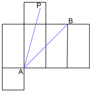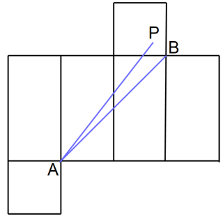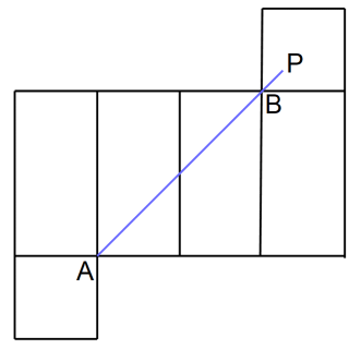 直方体の展開図を描いて、2点を結ぶ線分が最短距離です。