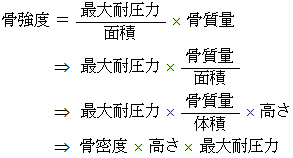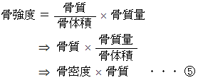 を得ることができます。 ただし、 一般的には、 骨強度 は 骨密度 と 骨質 の 掛け算 ではなく 足し算 になっています。 しかし、 量的なもの と 質的なもの、 このように次元の異なるものは足し合わせることはできませんので、 掛け算にすべきであると私は考えています。 そこで、 あえて掛け算の式を導いて紹介させていただきました次第です。