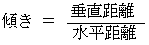 重力場の方向に平行な二次元平面の中の直線の傾き( 勾配ではない )は、 直線上の2点間の距離を用いて、 次の式で与えられる。