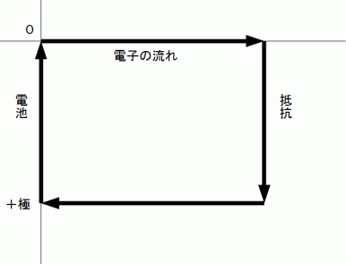 へと増大する。 その自由電子は電池の外側の抵抗の中を移動して電位の低い方へと流れていく。
