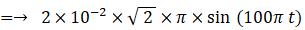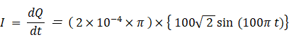キャパシタンス( 静電容量 )が 2×10-6 kg-1 m-2 s2 c2 のコンデンサに 100 V の周波数 50 Hz の交流電圧をかけると、電流( I s-1 c )が発生するが、その電流は電圧に対して90°位相が進んで変化する。電流が0の時を時刻 t = 0 として、電流を t s の関数で表せ。