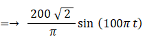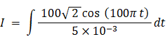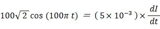 インダクタンスが 5×10-3 kg m2 c-2 のコイルに 100 V の周波数 50 Hz の交流電圧をかけると、電流( I s-1 c )が発生するが、その電流は電圧に対して 90° 位相が遅れて変化する。電流が0の時を時刻 t = 0 として、電流を t s の関数で表せ。