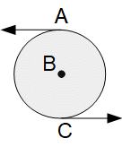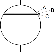 次の図は反時計回りに回っている地球です。緯度が僅かに異なる3本の緯線の同じ経線上に点A、点B、点C があります。これらの3点は点Bを中心とする微小円形地面を形成しています。点A、点B、点Cはすべて角速度は同じですが、緯線半径が違うために、速さが点A、点B、点Cの順に僅かに大きくなっています。したがって、点Bからすると、点Aは西向きにゆっくりと移動し、点Cは東西向きにゆっくりと移動していることになります。ということは、点Bを中心とする微小円形地面は反時計回りにゆっくりと自転してることになります。