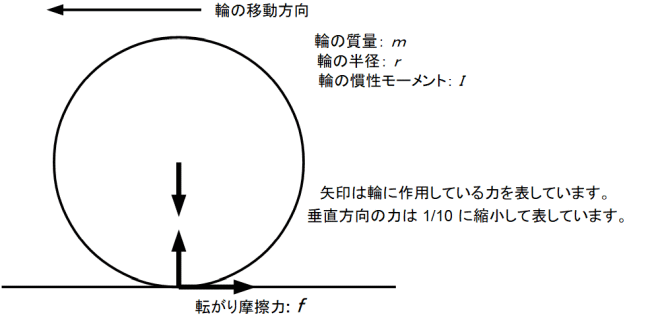 転がり摩擦は滑り摩擦に比べると大きさは 1万分の1 くらいです。 転倒回転移動の支点は 球 や 円柱 の地面との接点あるいは接線になります。 球 や 円柱 や 道路 からすると連続的に支点の場所は変化します。
