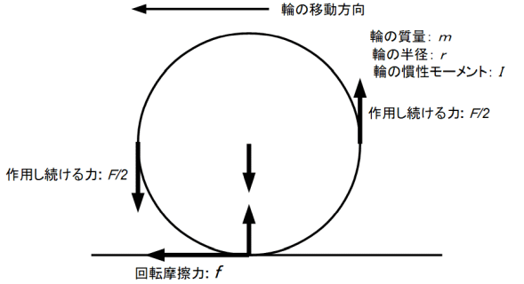 回転摩擦力はトルクとなって車輪の自転を減速しようとしますので、それをちょうど打ち消すだけのエネルギーを車輪に与え続けると等速移動になり、それ以上のエネルギーを与えると加速移動になり、それ以下のエネルギーを与えると減速移動になります。