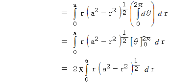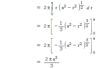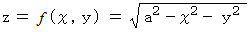 の球の、 XY平面より上側の半球の表面を表します。 この曲面に、 上からXY平面に垂直な平行光線を当てた時、 曲面の陰になる部分のXY平面よりも上側の体積、 つまり半球の体積、 を求めてみましょう。