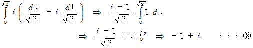 を足した値にはなっていません。 ということは、 一様なスカラー場という条件でのみ、 線積分するルートが異なっても始点と終点が同じであれば、 線積分の結果が同じになると予想できそうです。さて、 今回は複素平面上の複素数によるスカラー場を直線分に沿って線積分しましたが、 閉曲線に沿って線積分すると面白いことになります。 簡単に言いますと、 一般的には