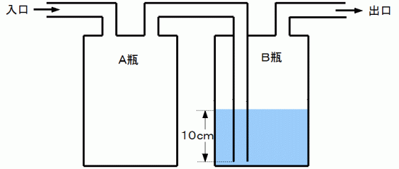 B瓶の中には水が入っています。過去に開腹手術を受けた人が、 柿などの消化の悪い物をよく噛まずに食べますと、 それが、 小腸の側壁どおしが癒着して折れ曲がっている部分に引っかかります。 小腸もなんとかそれを通そうと、 腸液を分泌し蠕動を盛んに行いますが、 それがかなわないとなると、 そこに炎症がおこり小腸の壁が水膨れして完全に閉塞してしまいます。 すると、それより上流で分泌される腸液がどんどん溜まってきて、 小腸は蠕動運動ができなくなって、 腸液は胃内へと逆流し、 ついには腸液を嘔吐するようになります。 これが腸閉塞です。 レントゲンをとると、 すぐに腸閉塞と診断することができます。 そしたらすぐに局所麻酔をして鼻から胃カメラを小腸内に挿入します。 胃カメラの長さの4倍もある細長いワイヤーの先を胃カメラの中を通して小腸に挿入したら、 胃カメラだけを引き抜きます。 そして、そのワイヤーをワイヤーの半分くらいの長さのチューブの中に通して、 チューブをワイヤーに沿って鼻から小腸内に挿入します。 チューブがワイヤーの先端に達したら、 ワイヤーを少し引き戻します。 すると、 チューブの先端は逆に小腸の中を大腸の方に向かって進んでいきます。 ワイヤーを入れたり引き戻したりしてチューブの先端をある程度進めたら、 ワイヤーを引き抜いてチューブだけを小腸内に留置します。 そして、 上のような装置の入口にチューブをつなぎ、 また、 出口を吸引配管につないで吸引配管の吸引力を調整して装置内の水の中を空気が少しずつ泡となって浮き上がってくるようにします。 すると、 小腸内は