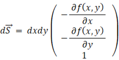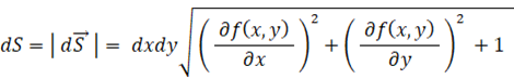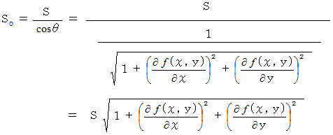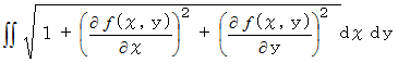 の総和の部分に相当する分の総和を取れば、 その範囲でのXY平面の真上にある部分の曲面の面積になりますので、 曲面の面積は次の式で表されます。