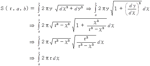 は、 球の表面上の点から球の中心に向かって x の距離の所で切り取ってできる球冠の面積を表し、 それが x に比例していることを表しています。 ということは、 同じ球からできる球冠や球帯は切り取る幅の長さが同じであればどこで切ってもその表面積が等しいことを示しています。