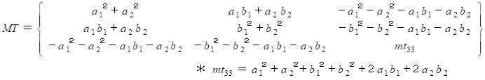 三角形の重心が原点にあるとき、 三角形のそれぞれの頂点の位置ベクトルの内積行列は三角形の辺の長さを用いて表すことができます。