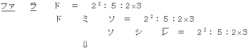 ドレミファソラシ の音たちは、ド:ミ:ソ の和音を元に作られているので、ドを 24 = 23×3 とすると、各音の振動数比は
