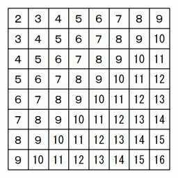 マスの行を上から順に 1 〜 8 、 マスの列を左から順に 1 〜 8 とします。 n 行 m 列 のマスの中に n+m の数字を入れていきますと、 同じ数が斜めに並びます。 また、 n 行 m 列 のマスの中に n−m+9 の数字を入れていきますと、 同じ数が斜めに並びます。