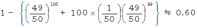 このゲームを100回したときに、 コインが100枚以上になっているための必要十分条件は2回以上勝っておくことです。 その確率は次のようにして求めることができます。