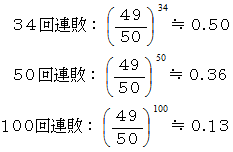したがって、 このゲームは、 何度も繰り返して行えば、 損するよりも得する可能性の方が高いということです。 ただし、 ゲーム1回ごとについては、 コインが増える可能性よりもコインが減る可能性の方が圧倒的に高いのです。 そして、 平均でも最初から34回は負け続けます。 なぜなら、 負け続ける確率が次のようになっているからです。