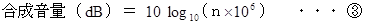 1音源の音量が 60 dB のとき、 n 個の音源の合成音量は次の式で与えられます。