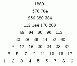 9段の数字のピラミッドがあります。 ある規則にしたがって下から順に組み立てられています。