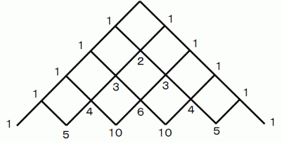 「 下図において、 答えも同時に記しているが、 頂点から各交点まで、 道を通って最短距離で進む方法は、 何通りあるか? 」 いう問題があります。