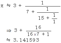 と考えて、 円周率は次の連分数で近似することができることが解ります。