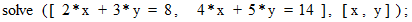 十進BASIC には、 逆行列を得る関数や行列に行列をかける演算が標準装備されていますので、 次のようなプログラムでも連立一次方程式を解くことができます。