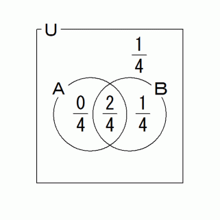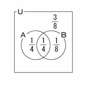 上の図から、 集合Bの補集合の部分を黒く塗りつぶして、 集合Bのみを全体集合とみなします。 すると、 全体の 8分の3 あたりに、 集合Aが占めるのが 8分の1 で、 集合Aの補集合が占めるのが 8分の2 になりますから、 赤玉が出たという情報が得られた時点で、 選んだ袋がXであったという時系的後ろ向き確率は 3分の1 になります。