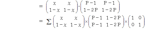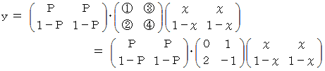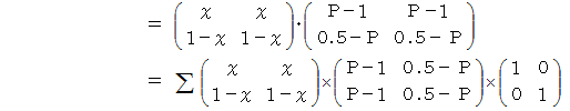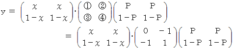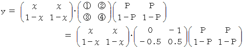 は何をしているのかと申しますと、 便利屋さんがAルートを選択した場合の 「 ラクした度 」 の期待値 と Bルートを選択した場合の 「 ラクした度 」 の期待値 とを求めているのです。 最後に内積をとっているのは、 便利屋さんがAルートを選択する確率にAルートを選択した場合の 「 ラクした度 」 の期待値をかけたもの と、 便利屋さんがBルートを選択する確率にBルートを選択した場合の 「 ラクした度 」 の期待値をかけたもの との合計をとっているのです。 その値