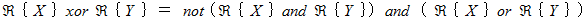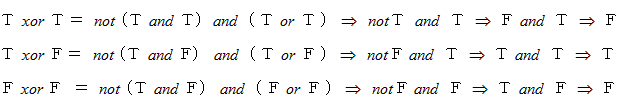 の真偽判定の結果が異なっているかどうかを判定します。異なっていれば T を出力し、 等しければ F を出力します。