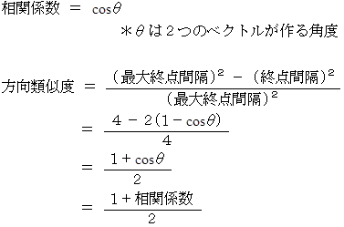 方向類似度 は、 言うなれば、 相関係数を 0 〜 1 の範囲になるように修正したものです。