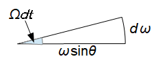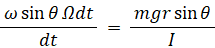 ( 大きさ ω rad/s )で回転しているコマを横から一瞬水平方向に力を加えて転倒させとうとすると、回転の角速度の大きさは変化せず、角速度の方向が垂直方向から θ rad だけ傾いた。その後1分間は角速度の大きさ ω rad/s と コマの傾き θ rad は一定で、コマは歳差運動を行った。このときの歳差運動の角速度の大きさを Ω rad/s とすると、Ω は g と m と I と r と
