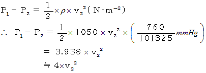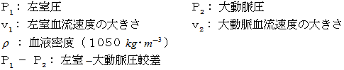 左室血流速度の大きさは大動脈内血流速度の大きさに比較すると著明に小さいので、 左室-大動脈圧較差 は、 上記の近似式で表される、 つまり、 大動脈内血液の単位体積あたりの運動エネルギーに等しいことがわかります。