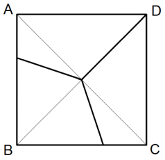 正方形を等しい面積に3分割する方法に、正方形の中心 と 頂点D とを結ぶ線分で切断し、かつ、正方形の中心 と 辺ABを 1:2 に内分する点 とを結ぶ線分で切断し、かつ、 正方形の中心 と 辺BCを 2:1 に内分する点 とを結ぶ線分で切断する というのがあります。その理由を考えてみましょう。