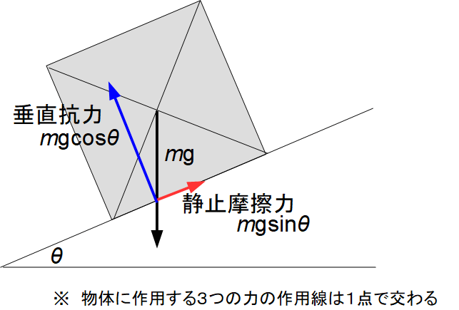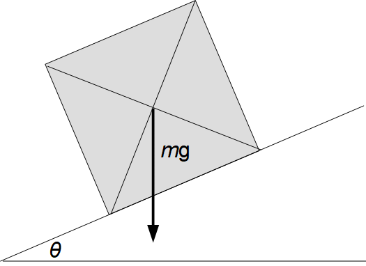 質量 m kg の密度が一様な立方体が 傾斜 tanθ の坂の上で静止しています。下図はそれを横からの水平方向から見た重心を含む断面図です。矢印はこの立体に作用している重力を表しています。g は重力加速度です。
