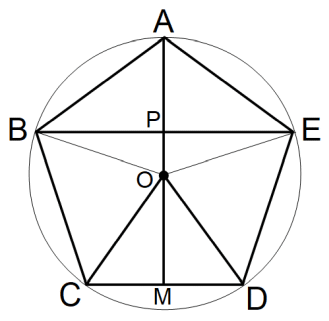 正五角形ABCDEの頂点Aから重心Oを貫いて対辺CDの中点Mに至る線分AM と 対辺CDに平行な対角線BE との交点をPとする。OAの長さは 1 である。