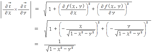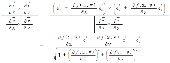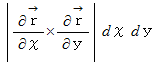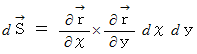 に対応する実際の曲面の区分された微小区間の面積を表しています。 これは面積素と言われます。 面積素に法線向きの方向性を付加したものは、 ベクトル面積素と言われ、 次の式で表されます。
