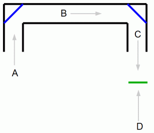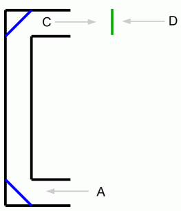 上の図は、 コの字型をした四角い潜望鏡の断面図です。 青色は鏡を表しています。 緑の透明な板にはC の位置から見て 上 という文字が書かれています。