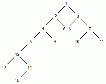 各節における分岐数が 0 〜 2 までで、 横や斜めの連結のない節が15個の 「 分岐階層構造 」 があります。 それは、 0階層に始まり、 −1,−2,−3, ・ ・ ・ と深い階層へと分岐しています。 0階層の節は1個だけです。 節には1から始まる自然数の番号が付いており、 それは浅い階層順で、 同じ階層ならば左から右へと向かう順になっています。