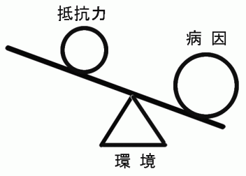 病因 と 抵抗力 がシーソーの上に乗っており、 これらの力のモーメントが絶えず変動していますので、 シーソーは絶えず揺れ動いています。 抵抗力のことを自然治癒力といってもいいと思います。 抵抗力の大きさは、 日頃の睡眠や栄養や運動や労働などにより変動します。