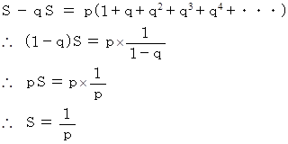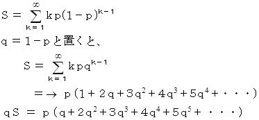 一般に、 1 回試行あたりの念願成就確率を p とし、念願成就の期待値を S 回 とすると、 次の式が成り立つ。